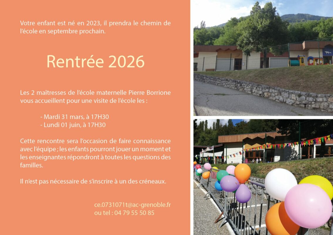 Votre enfant est né en 2023, il prendra le chemin de l’école en septembre prochain. – RENTREE 2026 – Les 2 maîtresses de l’école maternelle Pierre Borrione vous accueillent pour…